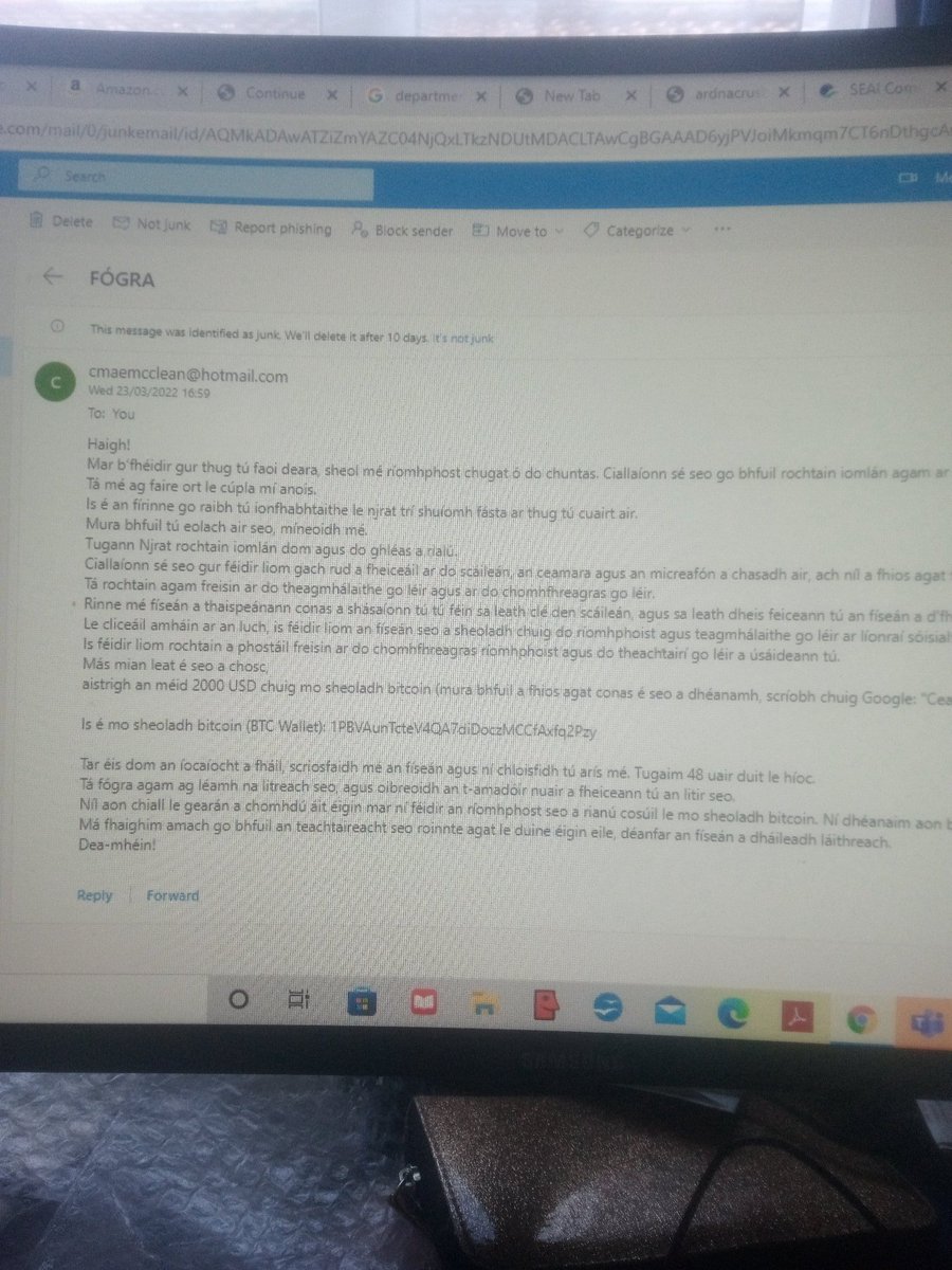 @gardainfo I received this#threat by email which I found in my junk this morning. Demands payment in#bitcoins and saying they had access to my email account. Is this a widespread random threatening message which has gone through#googletranslate? Where should I report it?pic.twitter.com/HdSzuZfAyW