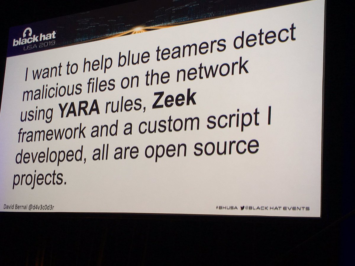@yararules to detect malicious files on your network?@d4v3c0d3r shows us w open source tools including@Zeekurity There will even be a white paper published on the BH server!!!