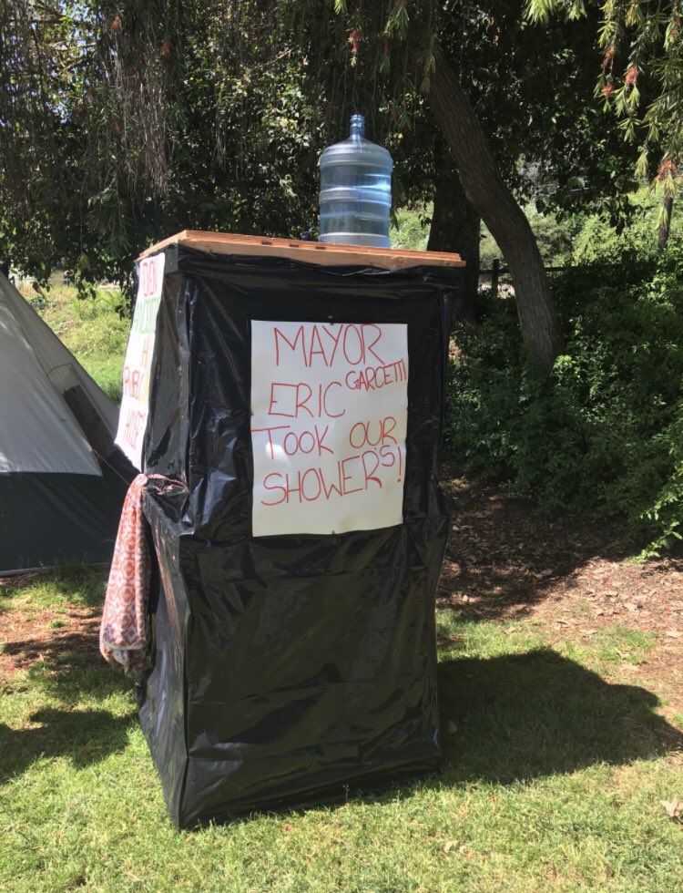 @mayorofla wants to give LAPD more $ as city shower trucks remain locked up and drop in shower services have shut down. The unhoused community at EP Lake had no choice but to build their own community shower.#CareNotCops#BlockTheLABudget pic.twitter.com/gnJiDStETF