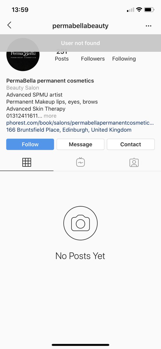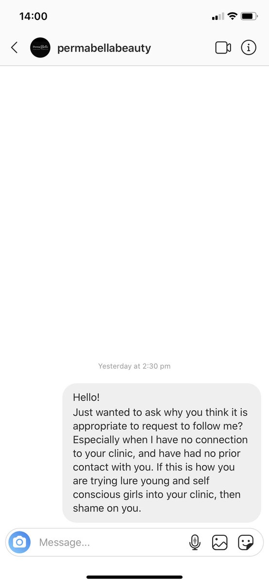 A cosmetic salon located on Bruntsfield Place requested to follow me on ig. Seemed strange, since I never heard of them and have never seeked cosmetic surgery from any salons. Uncomfortable by their odd, inappropriate request, I contacted them. They blocked me
