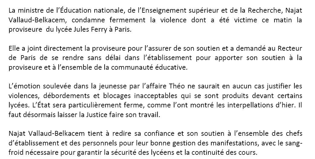#BlocusPourTheo La proviseure du lycée Jules-Ferry à Paris légèrement blessée. La ministre de l'Education condamne "fermement" (communiqué) pic.twitter.com/BgRoZBPlde
