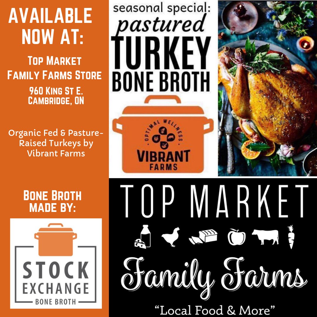 @stockexchangekw has created a custom batch of Turkey Bone Broth! They used our#VibrantFarms turkeys to form the base of this#traditional#delicious#sustainable &#nutritious#bonebroth. NOW available at Top Market Family Farms store in Cambridge (960 King St. E., Preston). pic.twitter.com/pJbTlxC7bH