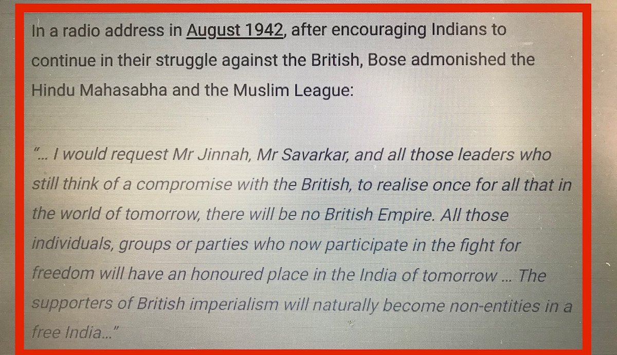 #NetajiSubhasChandraBose admonish#Savarkar &#Jinnah? 'Veer' had asked Hindus to support British by joining the colonial army in large numbers at a time when...#Bose had formed#AzadHindFauj &#MahatmaGandhi had launched Quit India movement to fight the British rule.pic.twitter.com/sewCaF9TVJ