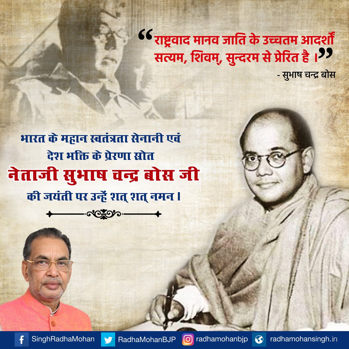 महान स्वतंत्रता सेनानी नेताजी सुभाषचन्द्र बोस की जयंती पर मैं उन्हें नमन करता हुंl नेताजी की वीरता हर भारतीय को गौरान्वित करती है। उन्हो ने आजादी की लड़ाई के लिए अपना सर्वस्व न्योछावर कर दियाl उनके साहस और देशभक्ति के किस्से आज भी देश के युवाओं को प्रेरित करते है।
