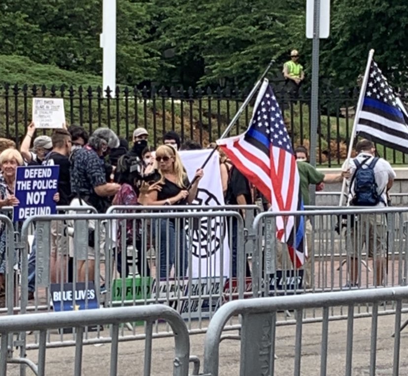 Look who’s protecting the fascists and staring down the BLM protesters while they pack up. Also, the fascists got barricades. BLM folx got hit by a car at a peaceful protest a few weeks ago.