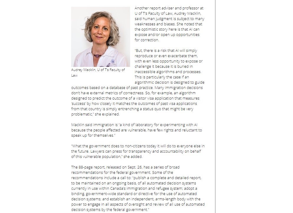Immigration is “a kind of laboratory for experimenting with AI because the people affected are vulnerable, have few rights and reluctant to speak up for themselves” CrimSL director Audrey Macklin was an adviser to the