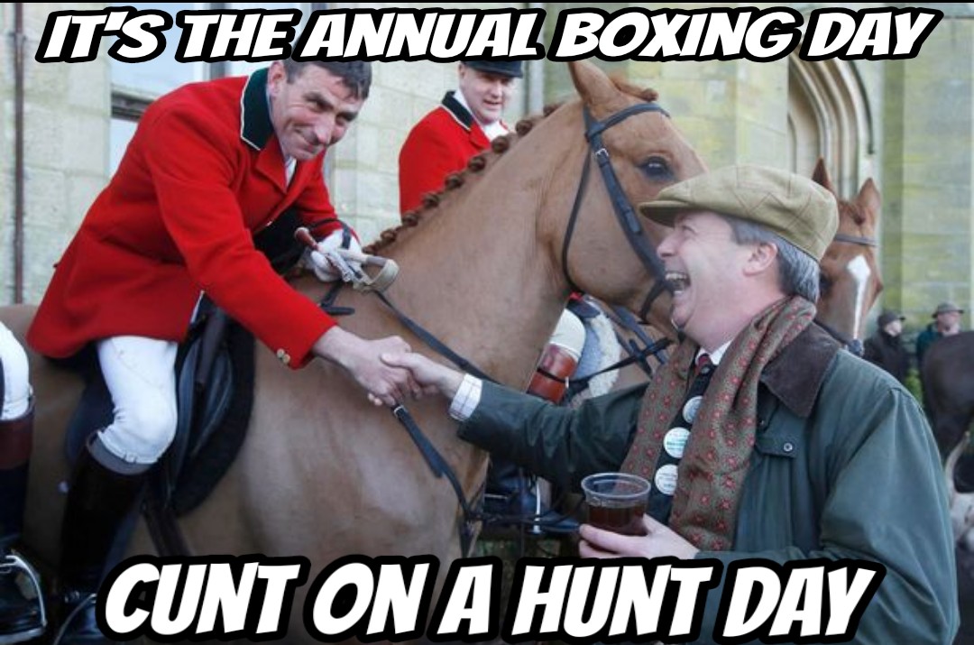 #boxingdayhunt I hope you get fucking shot. Or fall over and trampled by a horse. Or tbh anything that inflicts a great deal of pain so maybe you could UNDERSTAND WHY YOU ARE A FUCKING C*$T Merry boxing day people. Except those outlined above. -