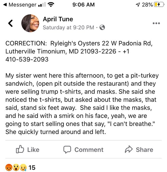@ryleighsoyster. Unfortunately he's still operating his Baltimore County location and spewing vile, racist garbage.#BoycottRyleighsOyster#BoycottRacism pic.twitter.com/SI98sQQWyC