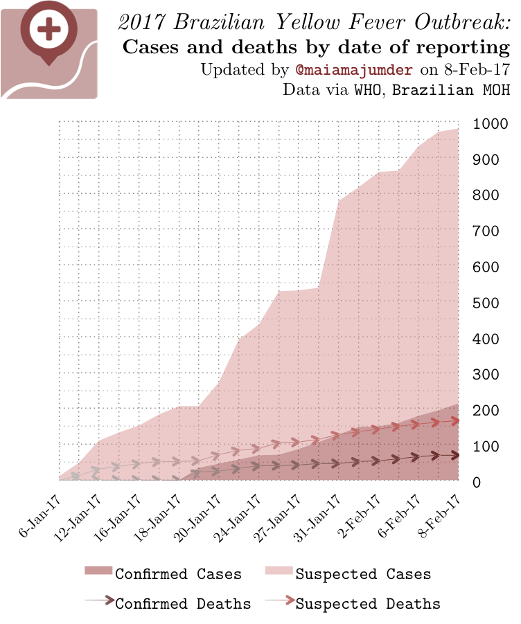 #YellowFever in#Brazil: Nearly 1000 cases have been reported in the last 4 weeks. (Current fatality rate = 33% among lab-confirmed cases.) pic.twitter.com/ZKYWhsFxpp