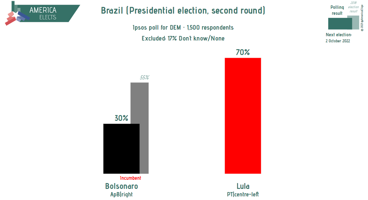 Brazil, Ipsos poll for DEM: Second round Lula (PT, centre-left): 70% Bolsonaro (ApB, right): 30% Fieldwork: N/A Sample size: 1,500