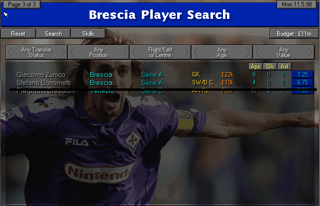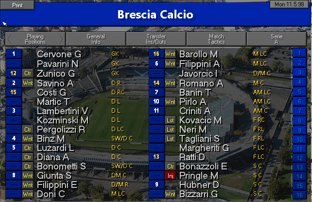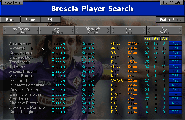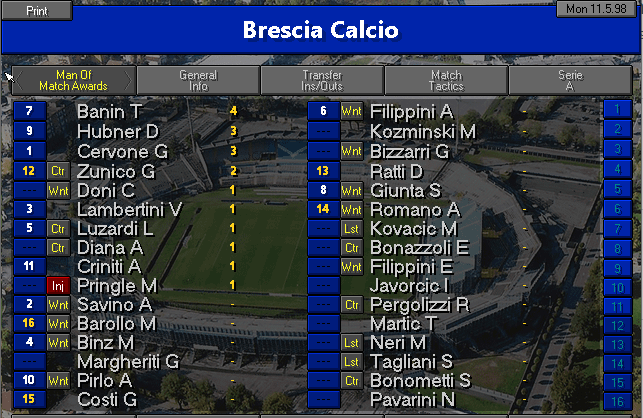 The stats from my squad. Searching by "Brescia" in the field name also returned a few players from other teams, which I crossed out with a black line.