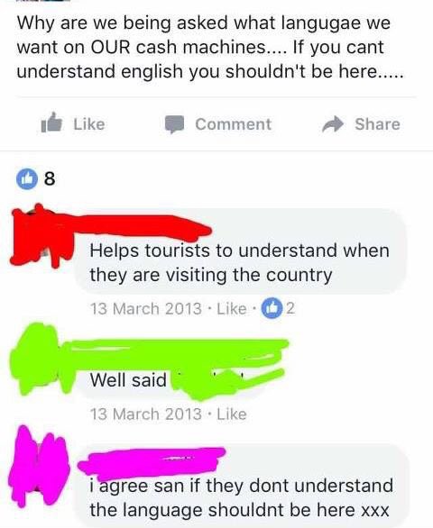 When you feel this level of offence at being offered a choice of language at an ATM, you have some self-reflection to do