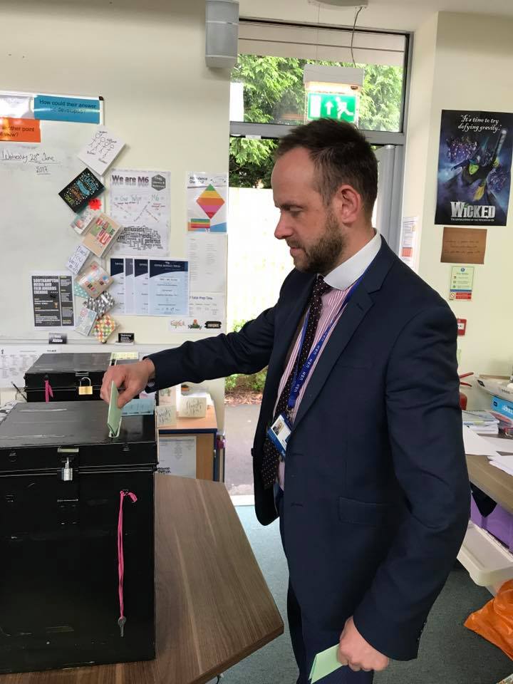Voting now now open! Mr Woods casts the first vote for Head Boy and Head Girl!