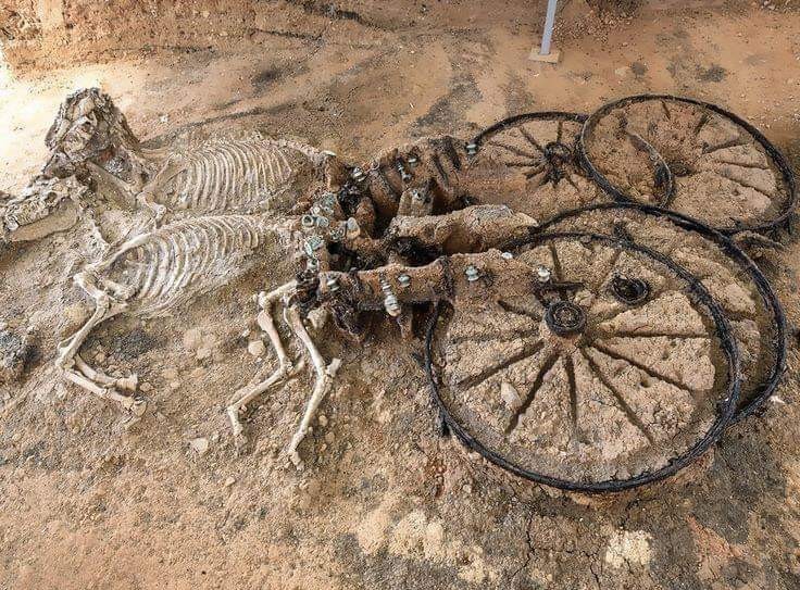 An amazing discovery from Bulgaria - A 2,000 year old Thracian chariot. Uncovered by archaeologists in 2008, the burial contained the remains of two horses and a dog, along with a wooden and bronze chariot.