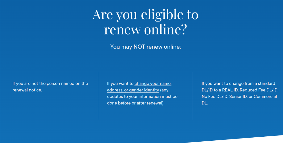 #cadmv I meet the criteria below for online renewal but I'm still not eligible for internet renewal and I'm still unable to make an appointment. My DL expires next week. Can you please have them extend the deadline until you allow online appointments? Stress is not healthy. pic.twitter.com/MUOcJwXaN7