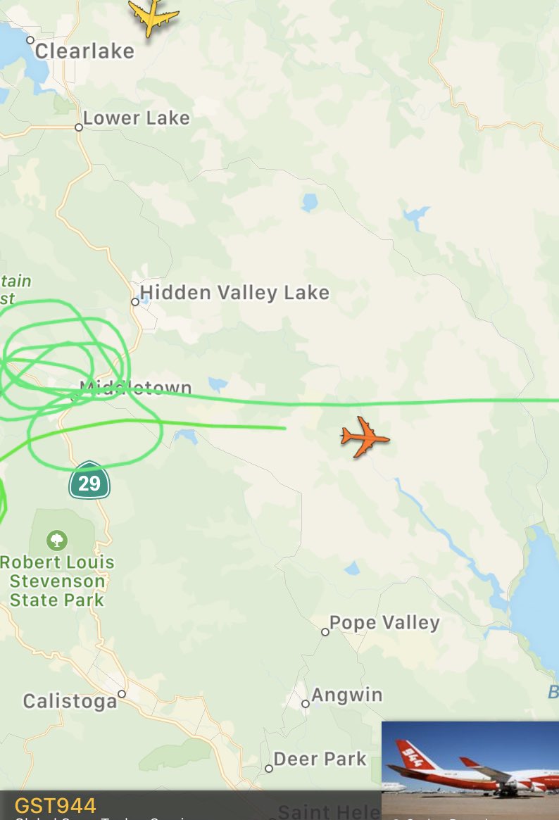 Global supper tanker 944 (a 747) just made a drop near Middletown. Reload and return eta back to the fire 1420 hours .