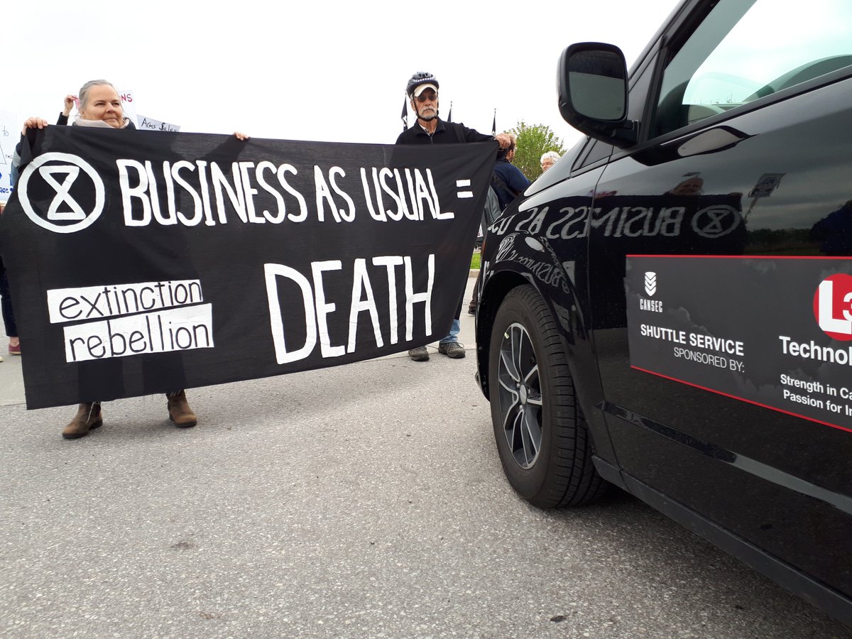 This morning Extinction Rebellion Ottawa and allies disrupted arms dealers & buyers from entering CANSEC, the largest arms trade show in Canada! Demilitarize, decarbonize! Arms to renewables! @OttawaRebellion