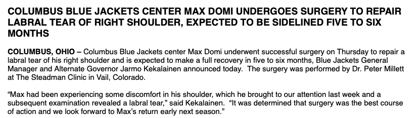 announce Max Domi underwent surgery to repair a torn labrum in his right shoulder and will miss the start of next NHL season. Domi is expected to be out 5-6 months.