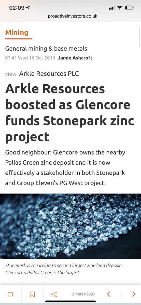 #ARK#Glencore Irish Gold and Zinc play. £1m Mkt cap. Moves like lightning as tiny free float. Expect it to Multi Bag like#CGNR just has, which I did give heads up at 7p for a couple of weeks ago. Check out#ARK. Thank me later Boomhttps://www.proactiveinvestors.co.uk/companies/news/904915/arkle-resources-boosted-as-glencore-funds-stonepark-zinc-project-904915.html …Prikaži ovu nit -