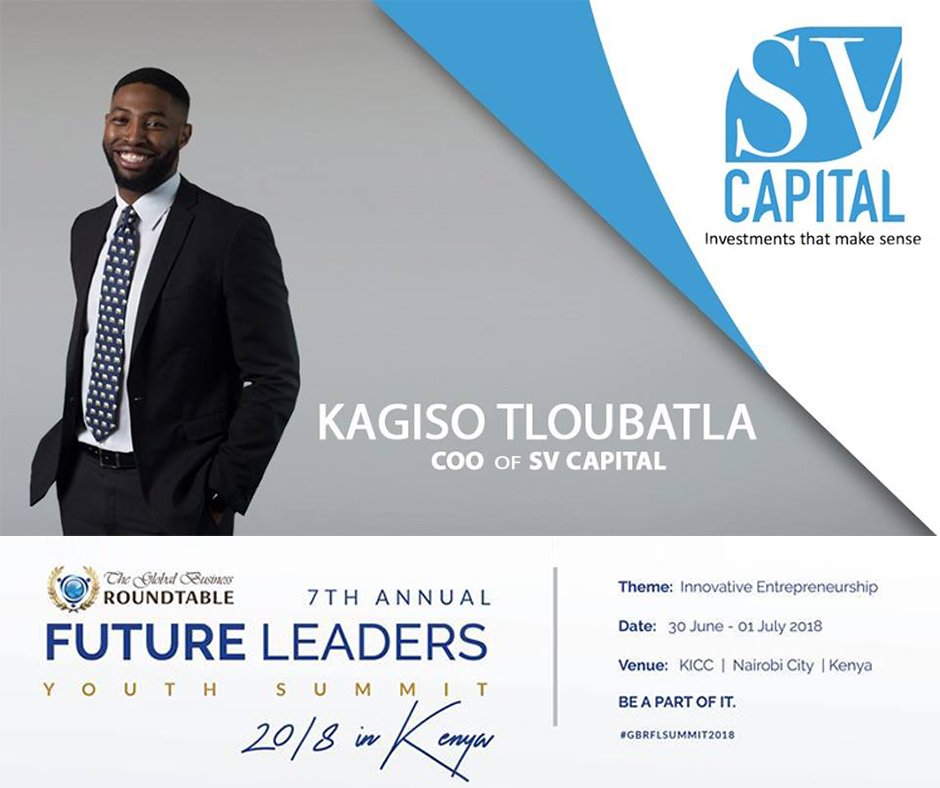 COO of SV Capital, Kagiso Tloubatla will be at the 7th annual Future Leaders Youth Summit 2018 in Kenya as a guest speaker from 30 June - 01 July at the KICC venue.