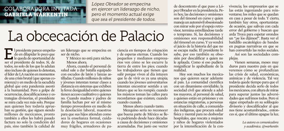 @Reforma de la maestra@warkentin sobre la figura presidencial en tiempos de#COVIDー19mx “Hoy las decisiones y omisiones son del timonel en curso y quien maneja un automovil obsesionado con mirar solo el espejo retrovisor, termina estrellándose tarde o temprano” pic.twitter.com/rjdpjraA62