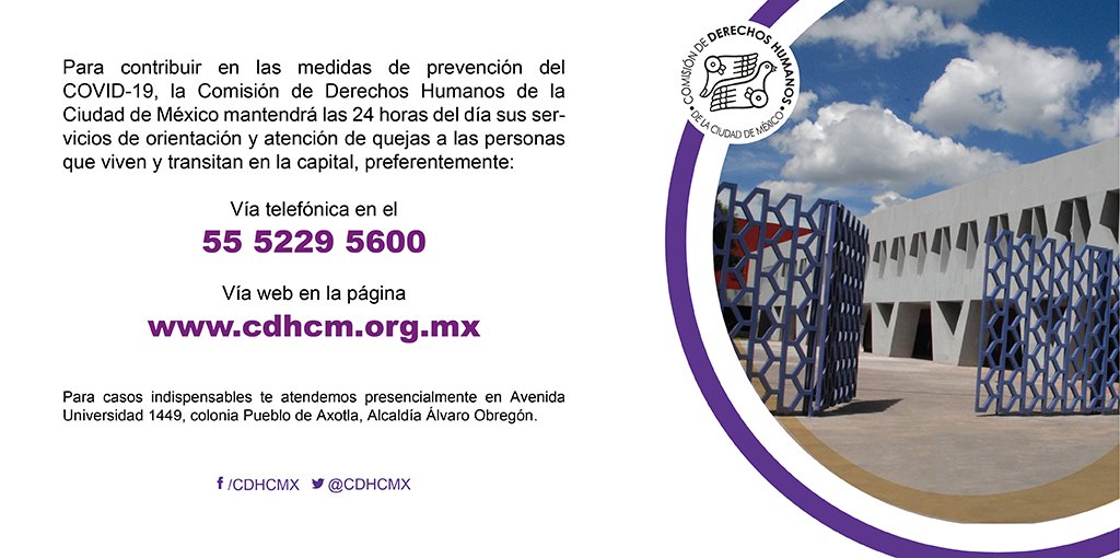 #COVIDー19mx operamos las 24 horas del día. Conoce las vías de contacto con la#CDHCM para atender quejas o brindarte orientación:pic.twitter.com/UybBo2IdnR