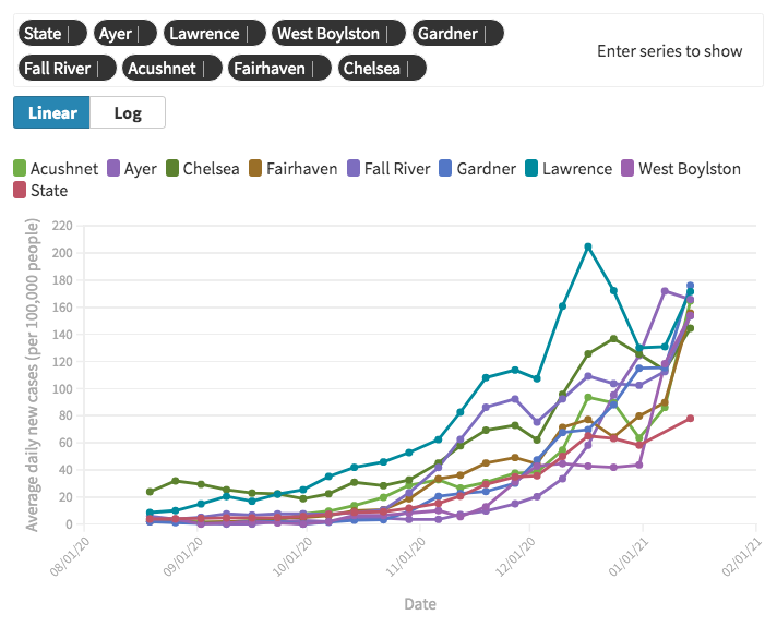 Top 8 MA cities & towns with the highest daily new COVID-19 case rate, all are above 150 cases/day/10,000 people and ~2X the state average. Map for every MA town/city is here: https://public.flourish.studio/visualisation/4804583/ … graphs here: https://public.flourish.studio/visualisation/4817758/ …