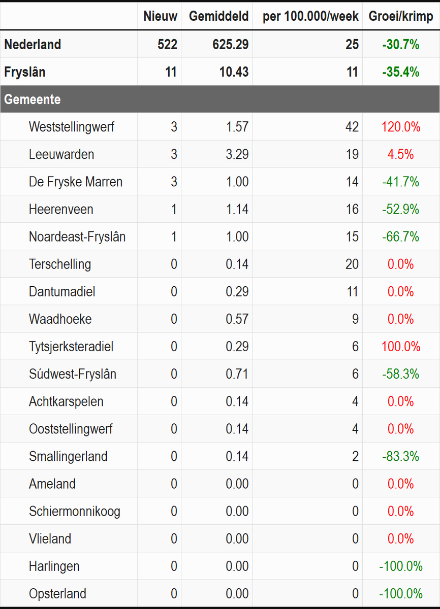 #COVID19NL in Friesland RIVM (27-06) Positief getest: +11 Totaal: 43852 Sterfte: +1 Totaal: 478 Ziekenhuizen (25-06) Gemelde opnames: +1 1. Nieuwe besmettingen 2. Aantal testen/percentage positief 3. Week op week groei 4. Besmettingen per gemeente pic.twitter.com/xZk7zIg3xH