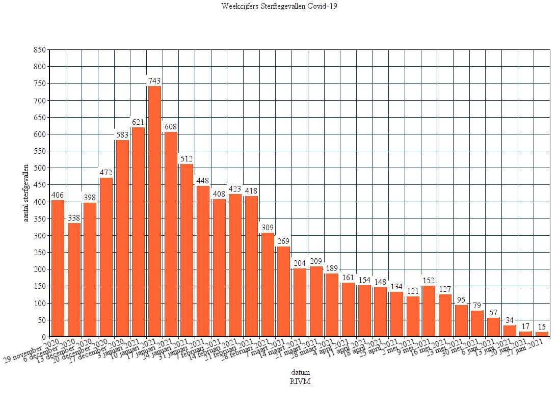 We zien in de weekcijfers van sterftegevallen gerelateerd aan een Covid-19 infectie een daling van 11,8%.