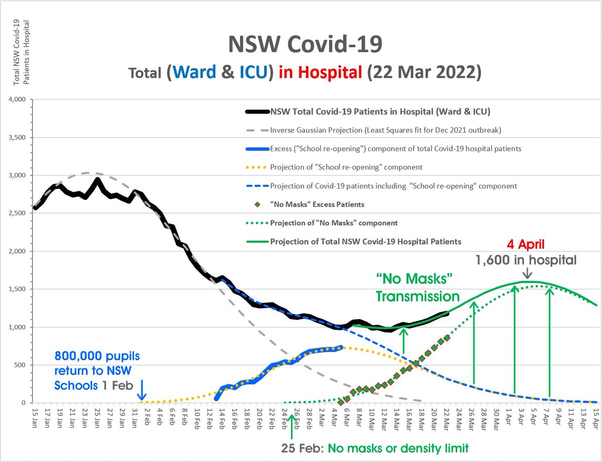 Quick update: 22 Mar HOSPITALISATION: predicting peak of ~1,600 patients on 4th April Now (1,177) 14% HIGHER than a week ago (1,032) “No Mask” Hypothesis: 856 people in hospital due to increased transmission from lifting NSW mask mandate, density limits on 25 Feb