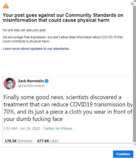 @Facebook removes posts that promote mask wearing because they could contribute to physical harm. FUCK YOU#Facebook#Covid_19#COVIDIOTS#MaskUp#WearADamnMask pic.twitter.com/HUwCzX0dV3
