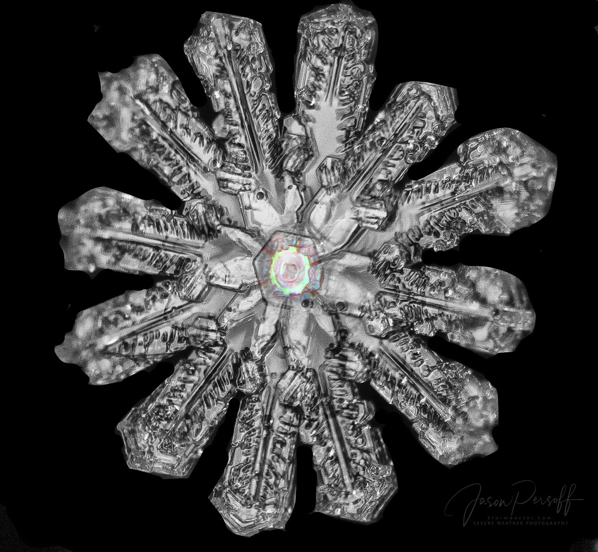 Since ice crystallizes at 109.5 degree angles, the only way to see a 12-branched snowflake is two flakes fusing together early in the nucleation. The center shows thin-film interference creating rainbows. From this am!