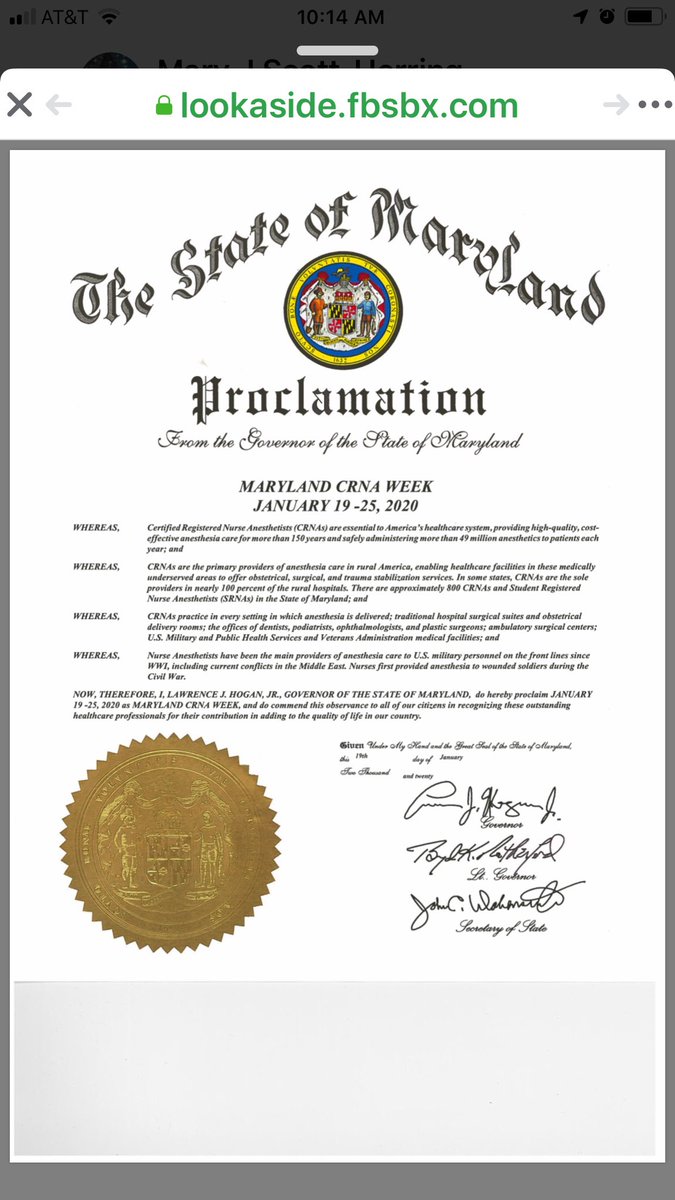 The Governor of Maryland’s proclamation of CRNA Week 2020.