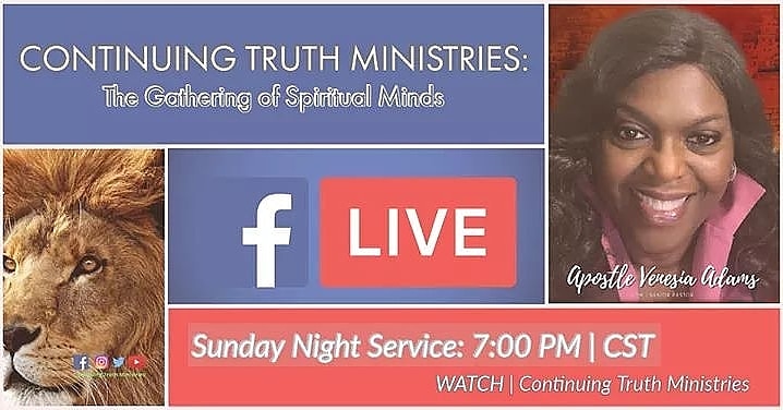 JOIN US IN 1-MINUTE!! . CONTINUING TRUTH MINISTRIES "Go Forth!! Praise Christ Jesus!!" . PREPARE FOR OUR: Sunday Night Service | TONIGHT 7PM . . Continuing Truth Ministries Sunday Night Service | 7PM . WATCH LIVE HERE: https://www.facebook.com/ContinuingTruthMinistries … SPREAD THE WORD . .