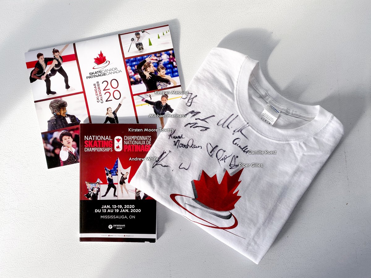 #CTNats20 which includes a shirt signed by several Canadian skaters (Including#PiperGilles,#KirstenMooreTowers/#MichaelMarinaro!), program booklet, and a Skate Canada calendar