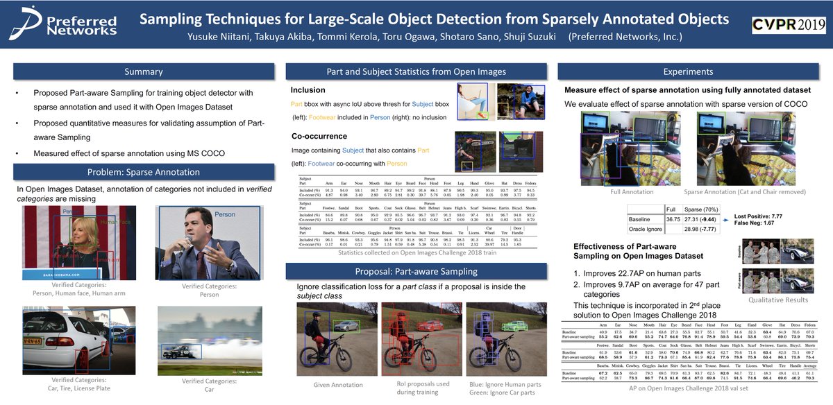 #CVPR2019 "Sampling Techniques for Large-Scale Object Detection from Sparsely Annotated Objects" used to win 2nd prize @ Google AI Open Images challenge (w/ Akiba, Kerola, Ogawa, Sano & Suzuki) http://openaccess.thecvf.com/content_CVPR_2019/papers/Niitani_Sampling_Techniques_for_Large-Scale_Object_Detection_From_Sparsely_Annotated_Objects_CVPR_2019_paper.pdf … pic.twitter.com/jbQjC7BO4u
