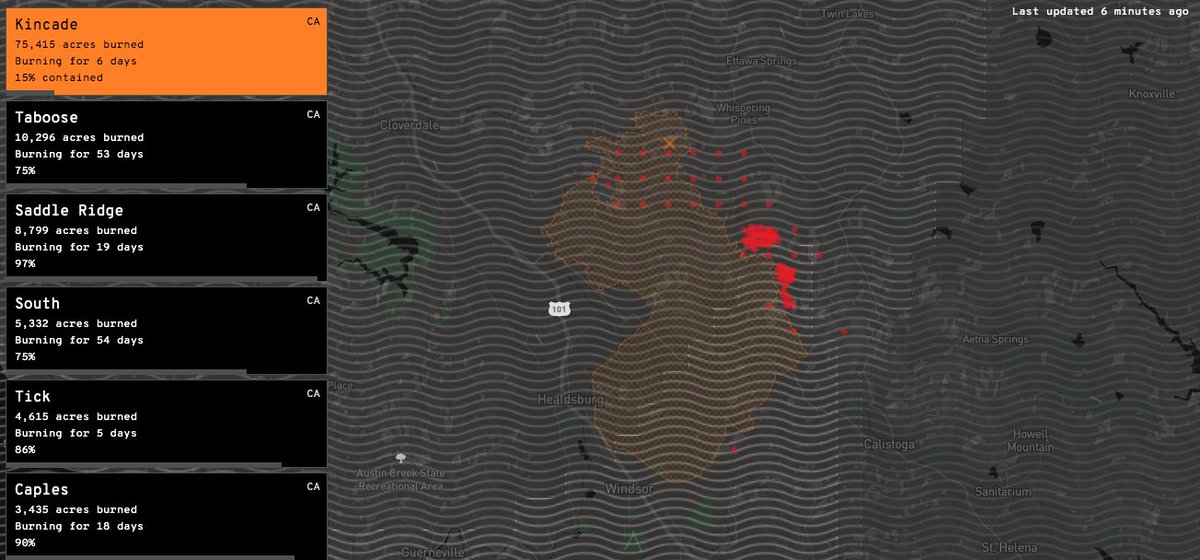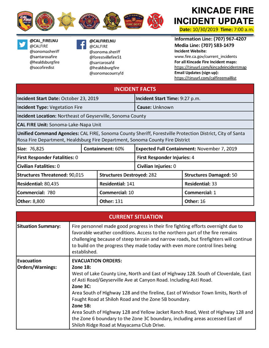 #KincadeFire off John Kincade Road and Burned Mountain Road, northeast of Geyserville in Sonoma County is 76,825 acres and 60% contained.#CALFIRELNU#CALFIRE pic.twitter.com/RpYp3D6waO
