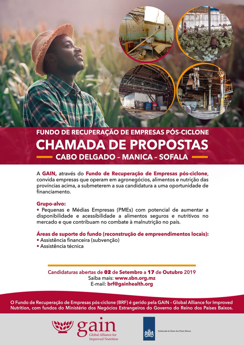 SME's affected by the cyclones in #CaboDelgado,#Manica &#Sofala, this is the opportunity to recover your business. More information @ http://sbn.org.mz/index.php/oportunidades-de-negocio/oportunidades-de-investimento … Lauched by@GainMocambique Funded by@DutchMFA#call4Proposal#ApplyNowpic.twitter.com/QSoVlGw3Pq