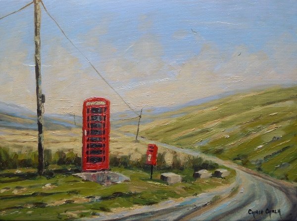 'Calling Long Distance', 16x12inch, oil. The most remote phone box in Wales, it's situated on the mountain road between Tregaron and Abergwesyn