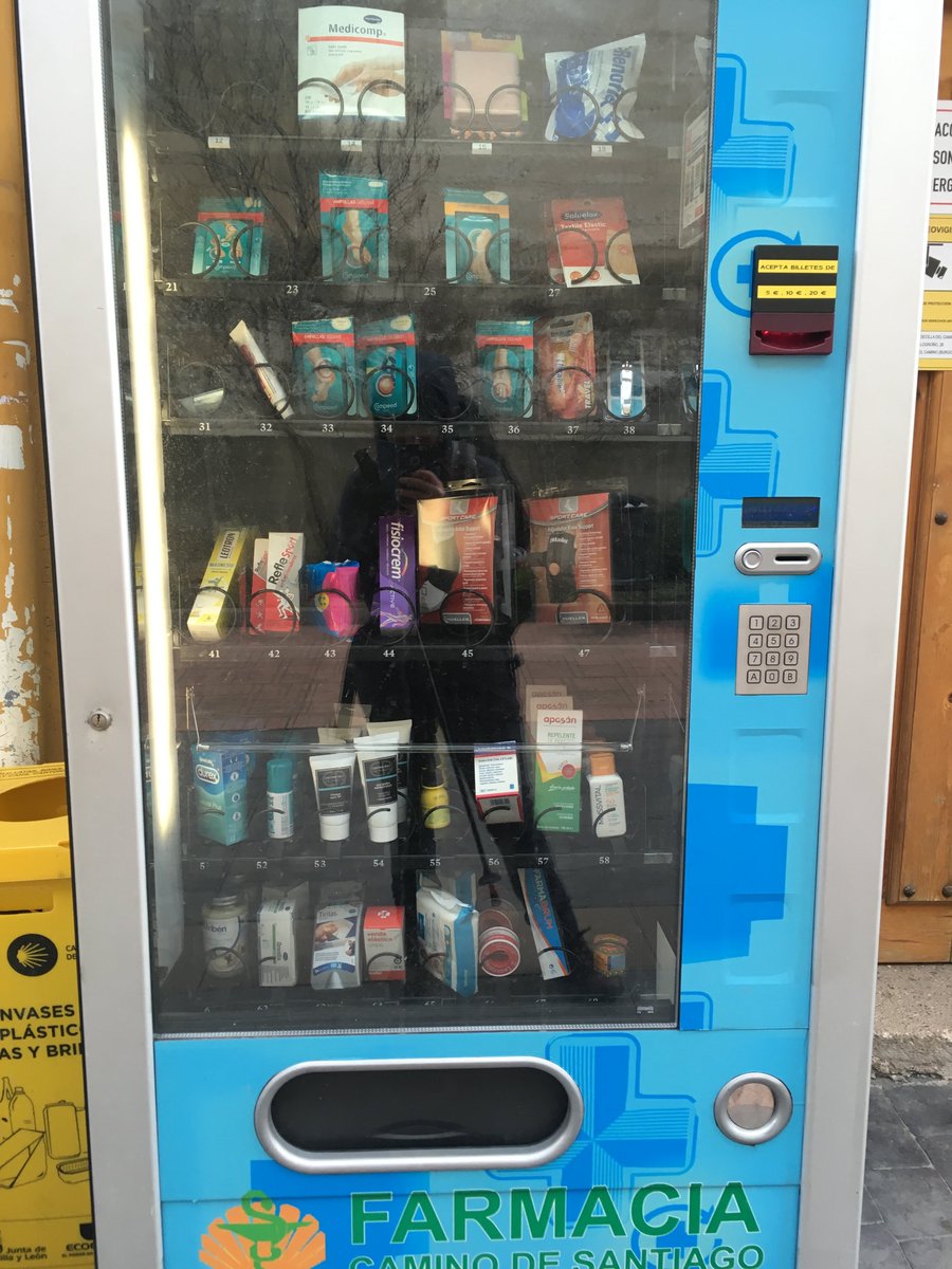 #CaminoTuesday. I never ceased to be amazed at the contents of vending machines on the way. Selling all the foot care you might need, distance markers, and even sex!#CaminodeSantiago pic.twitter.com/WeIlYaf9VD