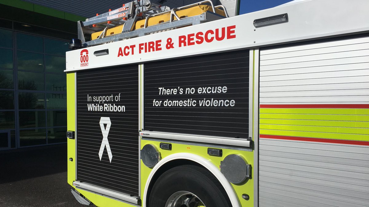 #Canberra fire pumper with@WhiteRibbonAust branding to send the message "there's no excuse for domestic violence".@WINNews_ACT 6PM.pic.twitter.com/FuQJsNtulk