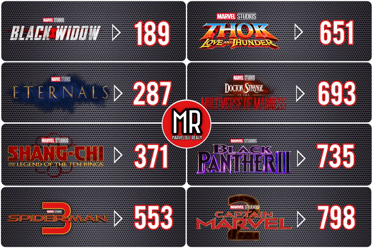 #BlackWidow | Nov 6, 2020#Eternals | Feb 12, 2021#ShangChi | May 7, 2021#SpiderMan 3 | Nov 5, 2021#Thor 4 | Feb 11, 2022#DoctorStrange 2 | Mar 25, 2022#BlackPanther 2 | May 6, 2022#CaptainMarvel 2 | Jul 8, 2022 (All dates still subject to change) pic.twitter.com/3jfSA7Bdgp