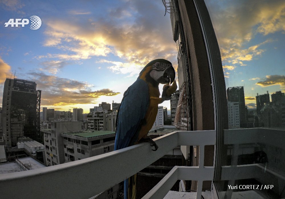 A flock of blue and yellow macaws (Ara araurana) fly over apartment buildings in Caracas. Every afternoon dozens of macaws flock to balconies and terraces where residents place food to attract them.