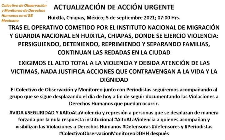 #AlertaFronteraSur#LlamadoUrgente Ante la salida de un nuevo grupo de personas de manera colectiva de Tapachula hacemos un llamado al respeto a la integridad física y emocional de todas las personas.#ColectivoObservacionMonitoreoDDHH#LuchasMigrantes#CaravanaDeMigrantes pic.twitter.com/h9bmPNoIcB