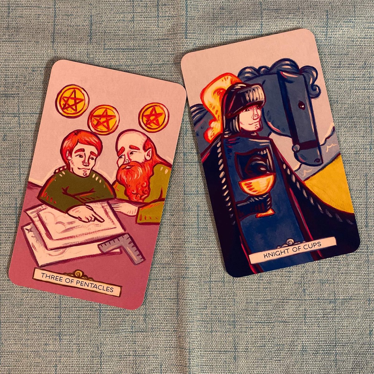 [7 Feb] 3 of Pentacles (Energy) + Knight of Cups (Guidance) from the Vivid Journey Tarot by Jessica Alaire. You’ve made your