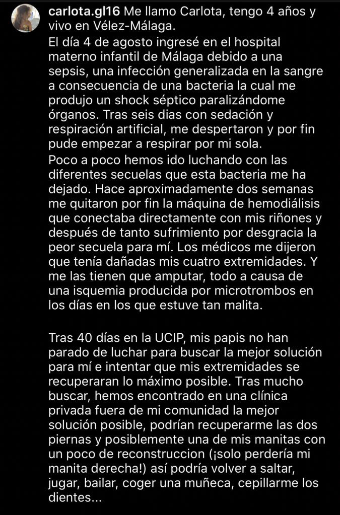 #Carlota | RT!! Nunca pedimos nada, más allá de que vengáis a probar y jugar con nosotros, pero nos ha calado fuerte esta historia. Carlota de 4 añitos podría perder sus extremidades debido a una Sepsis con necrosis. RT! +INFO: https://instagram.com/carlota.gl16?igshid=9h9xvgqhuvbo … https://www.facebook.com/Ayuda-para-Carlota-109089770940076/ … pic.twitter.com/zvyqCGEiIj