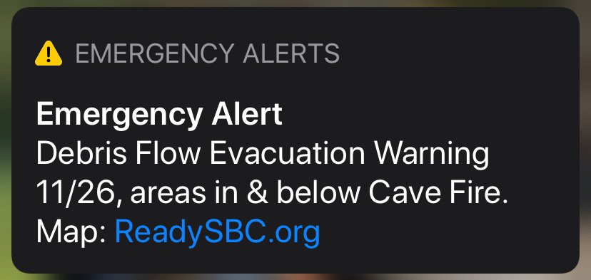 Debris Flow Evacuation Warning in areas below the Cave Fire in the City of Santa Barbara. Map here: http://bit.ly/evacwarning
