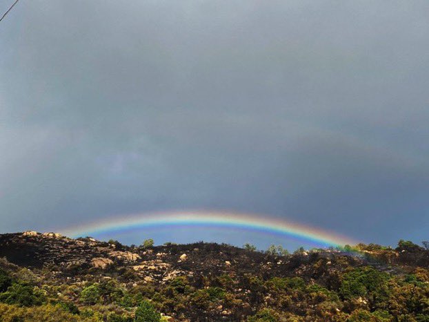 First rain, now a rainbow right above the smoldering