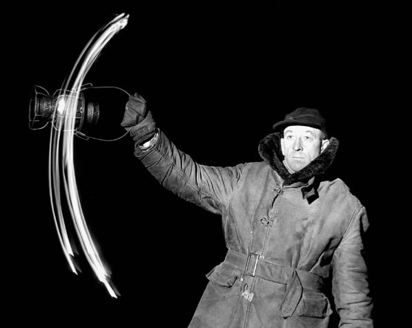 A brakeman swings his lantern to give the go-ahead signal to a train that is approaching in 1943. Location unknown. *LAC RG53* *trainhistory