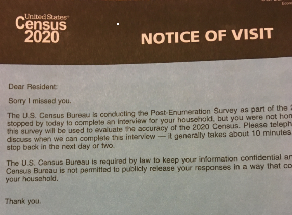 A Census 2020 worker stopped by my house today, while I wasn't here. This is real! How exciting